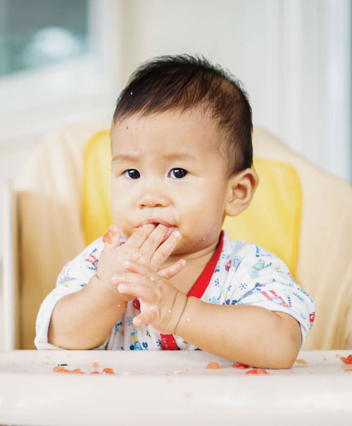 2. Coloque la mano izquierda con suavidad detrás de las orejas y el cuello del bebé, con el pulgar y el índice detrás de cada oreja y la palma entre los omóplatos del bebé. Gire el cuerpo del bebé hacia el suyo, de modo que se toquen las pancitas.
